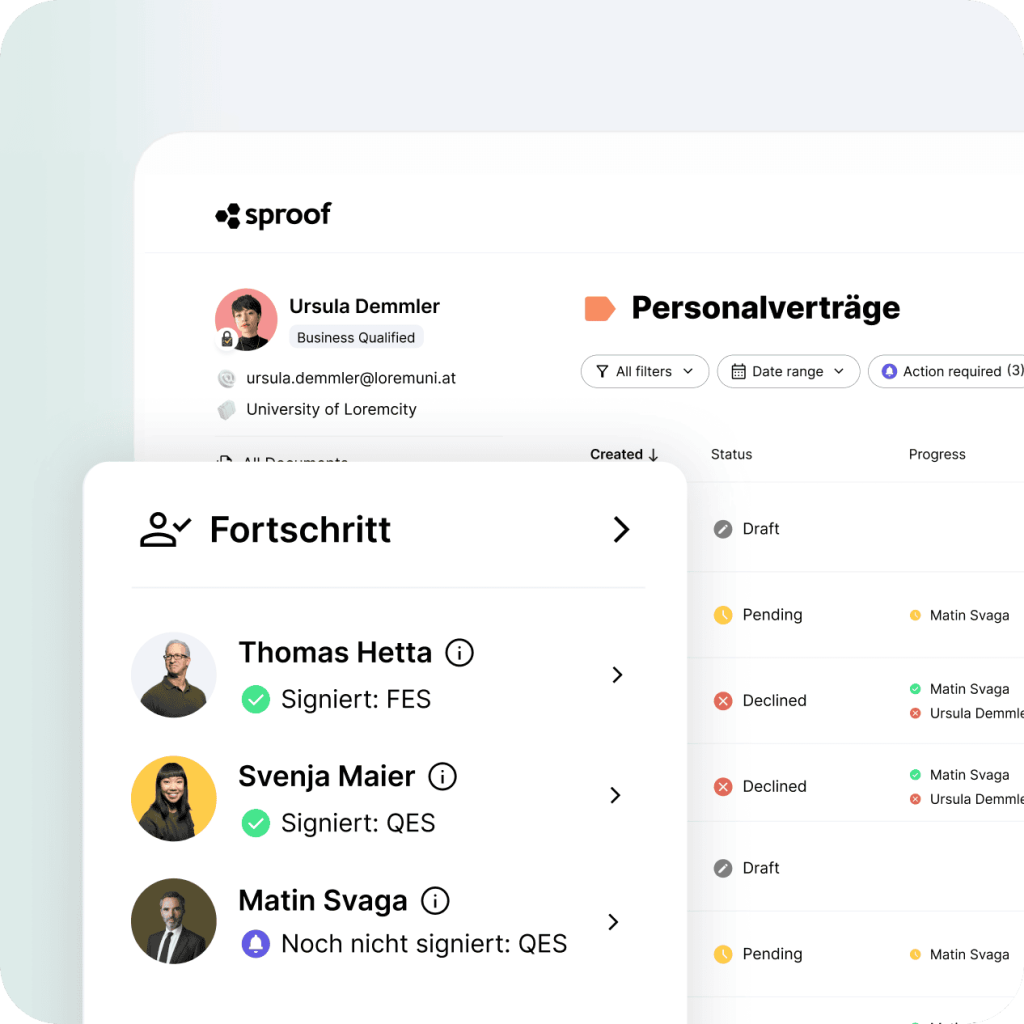 Die sproof GmbH wurde gegründet, um eine umfassende E-Signaturlösung zu entwickeln, die kompromisslos sicher, zuverlässig und international einsetzbar ist. 100 % eIDAS- & ZertES-konform, ISO 27001-zertifiziert und vollständig in der EU gehostet – für Unternehmen, die höchste Compliance-Anforderungen erfüllen müssen.