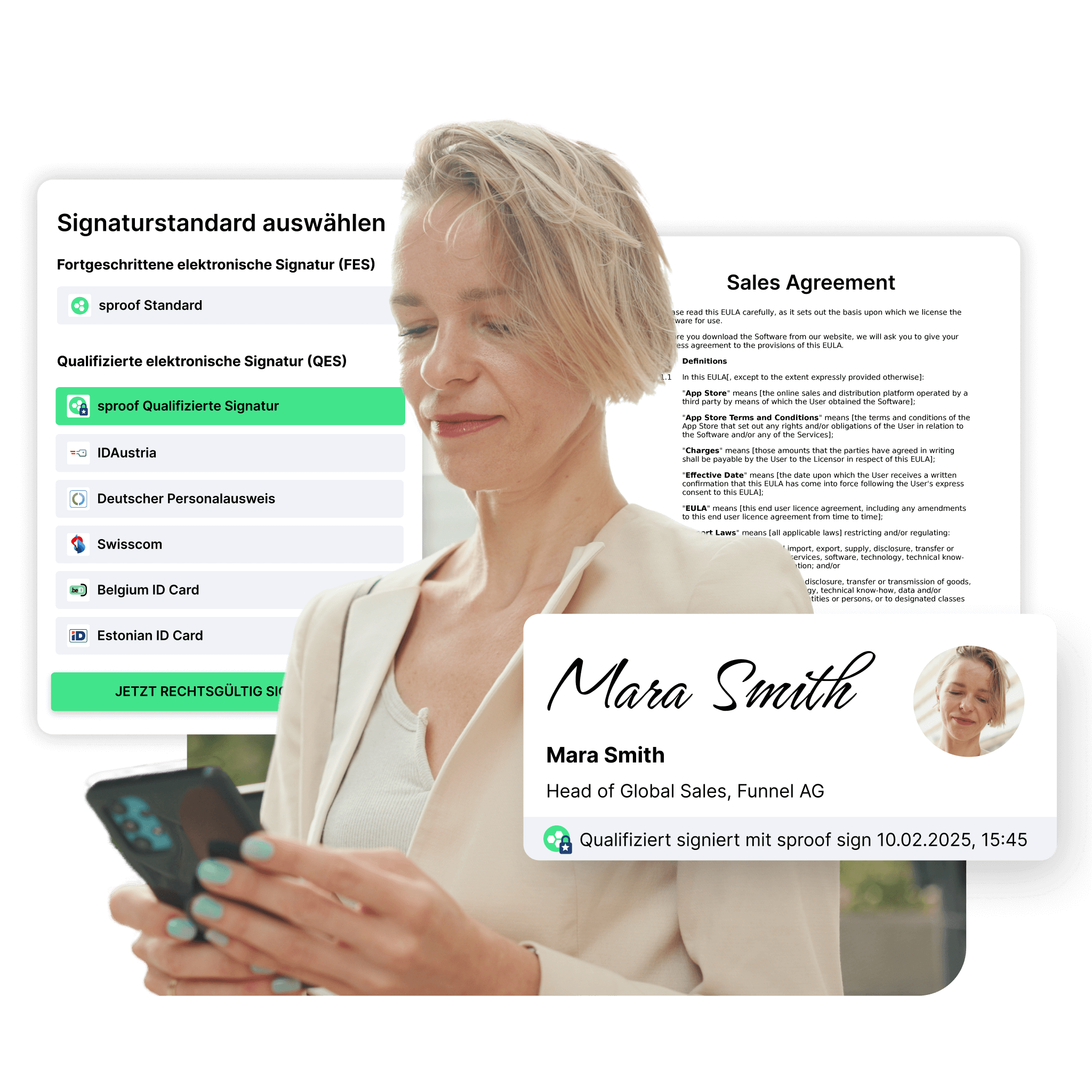 - Der eID-Hub von sproof sign integriert nationale eIDs und beschleunigt internationale Geschäftsprozesse. Mit ID Austria, dem Deutschen Personalausweis und vielen weiteren europäischen Identitäten signieren Nutzer:innen sofort qualifiziert – ohne zusätzlichen Identifikationsaufwand.