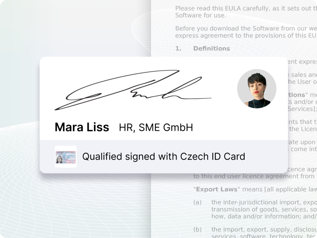 - You and your business partners in the Czech Republic can sign contracts and important PDF documents directly in sproof using an existing identification with eObčanka (Czech ID Card) - 100% legally secure thanks to the Qualified Electronic Signature (QES).