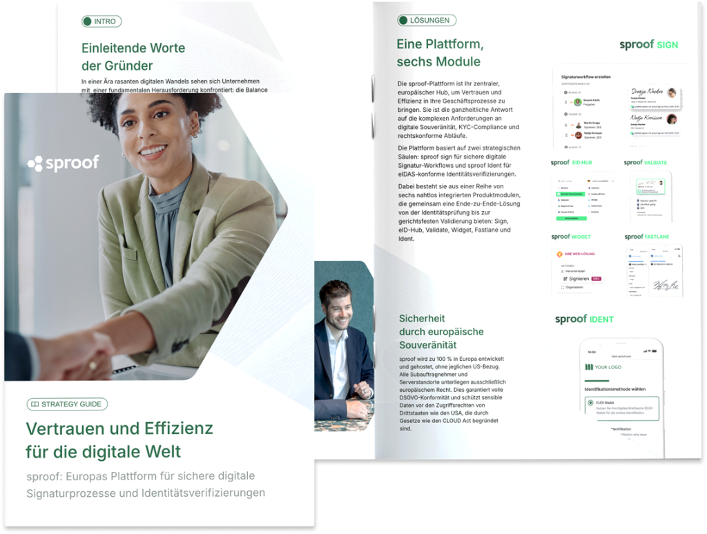 Ein Überblick über die modulare sproof-Plattform – von der Identitätsprüfung bis zur Validierung. Lernen Sie die sechs Produktmodule kennen, die gemeinsam eine nahtlose, eIDAS-konforme Lösung bilden:
