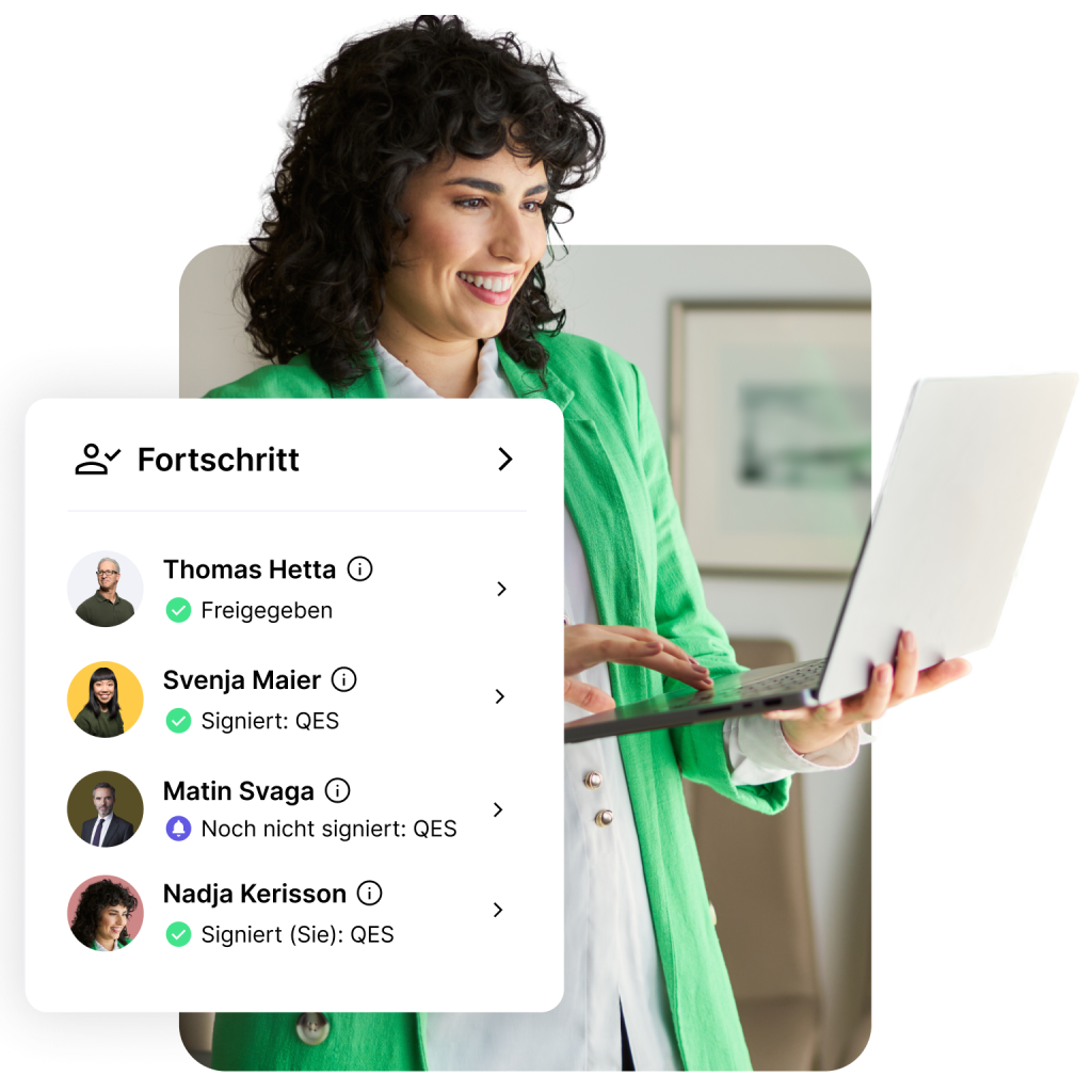 - Fortschritt & Nachvollziehbarkeit: Live-Tracking, Signaturprüfung & vollständiger Audit-Trail.