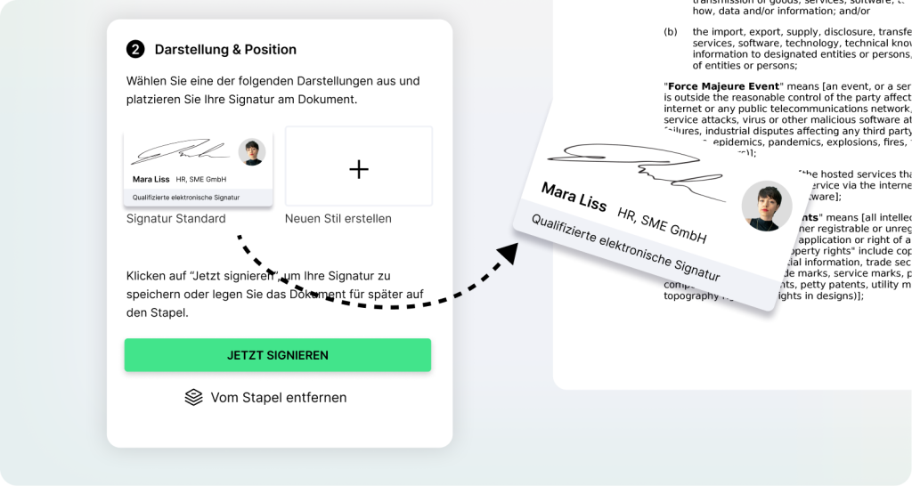 Platzieren Sie Ihre digitale Signatur an der gewünschten Position, klicken Sie auf “Jetzt signieren” und identifizieren Sie sich mit den Zugangsdaten Ihres eID-Anbieters. Sie haben Ihr Dokument rechtsgültig signiert.