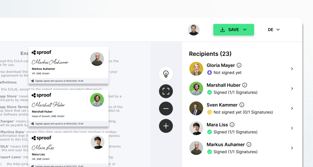 Dankzij de API-integratie werkt het hele ondertekenproces rechtstreeks binnen ons contractbeheer. Ik start de ondertekening, het sproof venster wordt geopend, ik onderteken – en zodra het proces is voltooid, wordt het document automatisch afgespeeld. Op deze manier zorgen we ervoor dat onze processen niet alleen digitaal, maar ook efficiënt en gebruiksvriendelijk zijn.