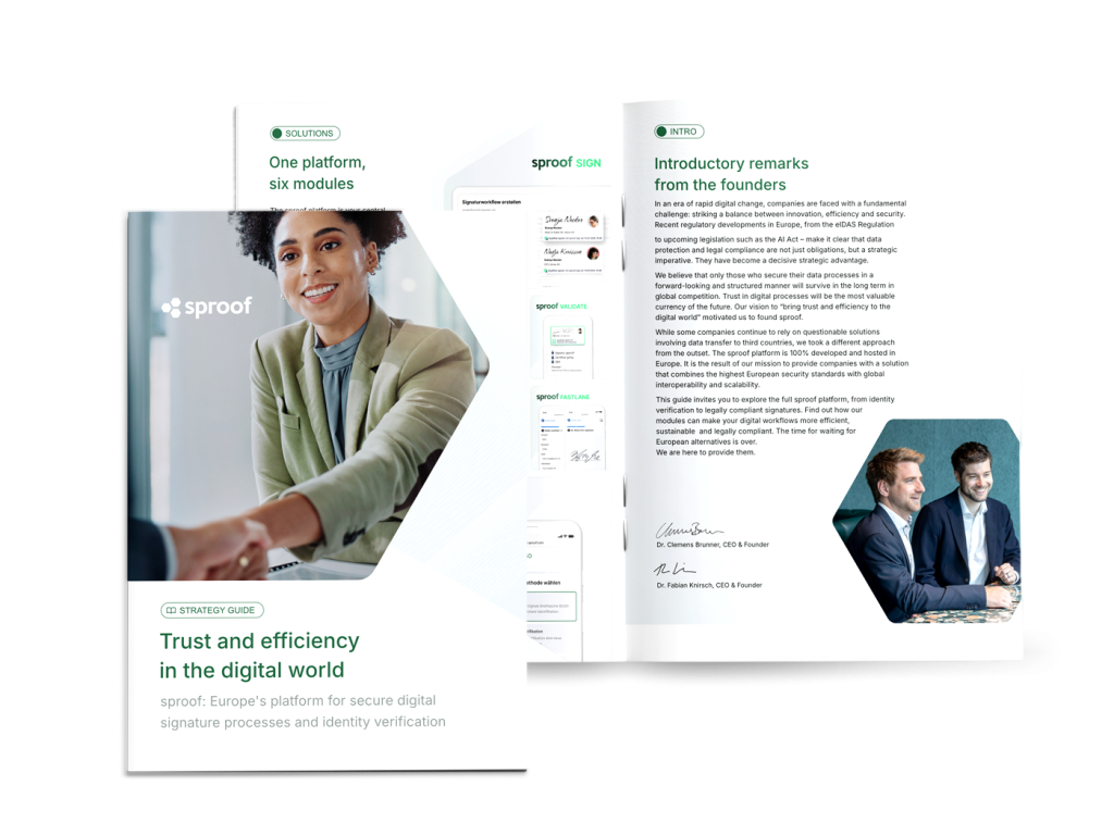 - Jakie standardy e-podpisu oferuje sproof dla firm?Podpisy złożone za pomocą sproof są w 100% prawnie ważne i spełniają wymogi prawne rozporządzenia eIDAS. Dzięki zaawansowanemu podpisowi elektronicznemu…