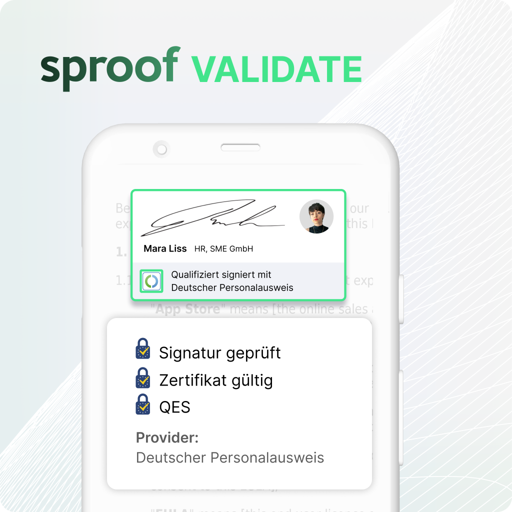 Mit sproof validate überprüfen Unternehmen digitale Signaturen auf Standardvertägen rechtskonform und validieren ihre Echtheit automatisiert per Software oder API.