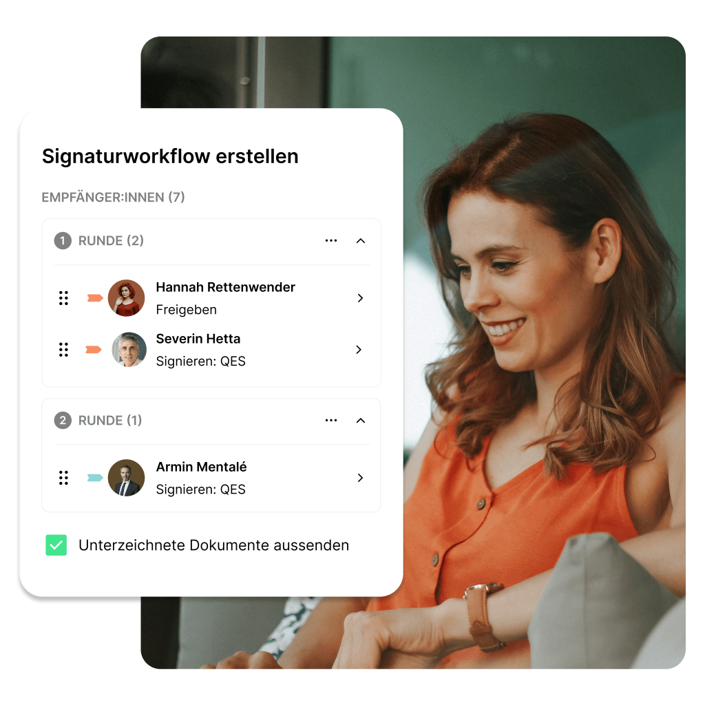 E-SignaturworkflowsMit Reihenfolgen, Fortschrittskontrolle & Erinnerungen. Alle Aktionen transparent im Audit-Trail verfügbar.